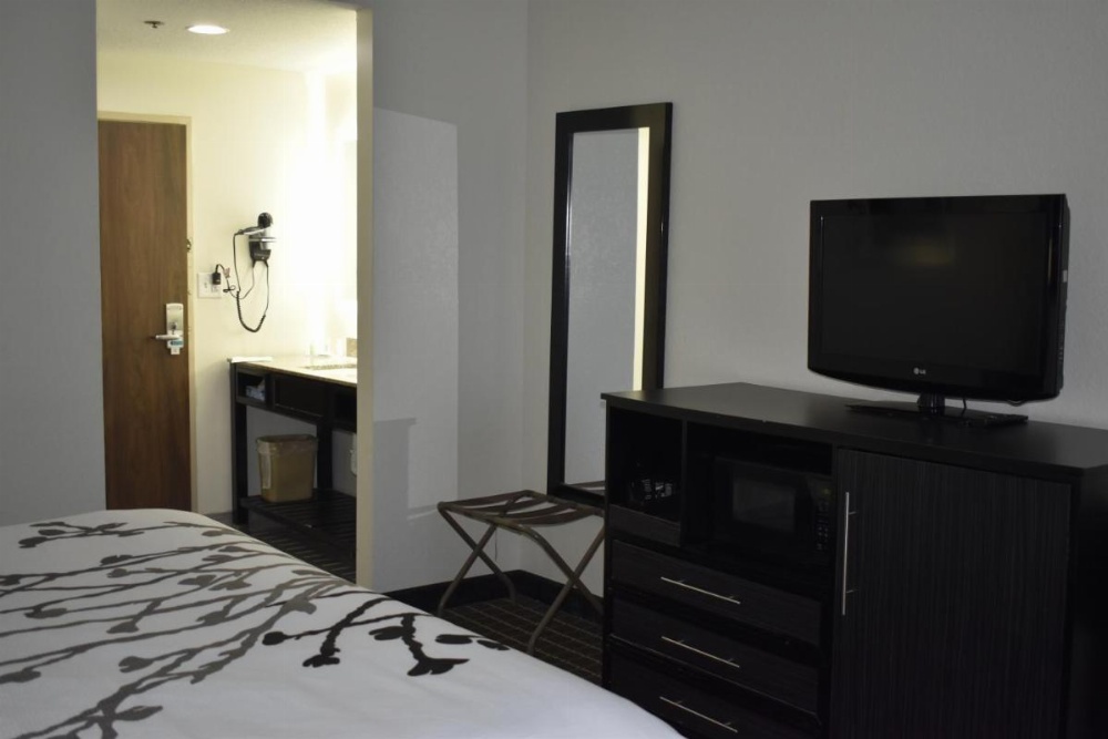 This room features a flat-screen TV, refrigerator, microwave, coffeemaker and ironing facilities.